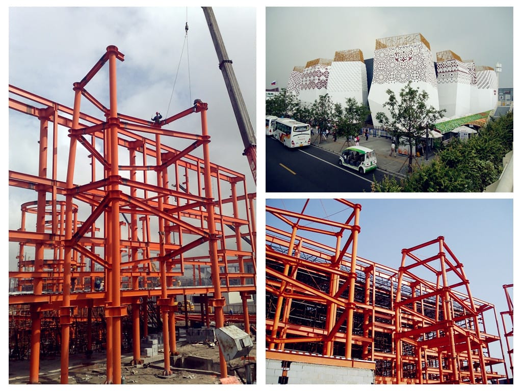 俄羅斯館展區(qū)占地6000平方米,有12幢高聳的不規(guī)則形狀塔樓,象征著遍布摩天大樓的超百萬(wàn)人口大城市。所有塔樓形成的俄羅斯環(huán)舞造型,代表著無(wú)盡的融合。白金顏色的高塔可以給人一種俄羅斯古代建筑設(shè)計(jì)特色的印象,圖案則是居住在俄羅斯的各民族元素。所有的塔樓都呈L形,水平部分連接到中央廣場(chǎng),在中央廣場(chǎng)上是一個(gè)巨大的“文明立方”,也是俄羅斯館的主展示廳。立方體高度約為20米,底層的5米是一個(gè)城市廣場(chǎng),將對(duì)俄羅斯的城市建筑發(fā)展史進(jìn)行詳細(xì)介紹。在上部15米的巨大空間里,將是一個(gè)兒童花園。